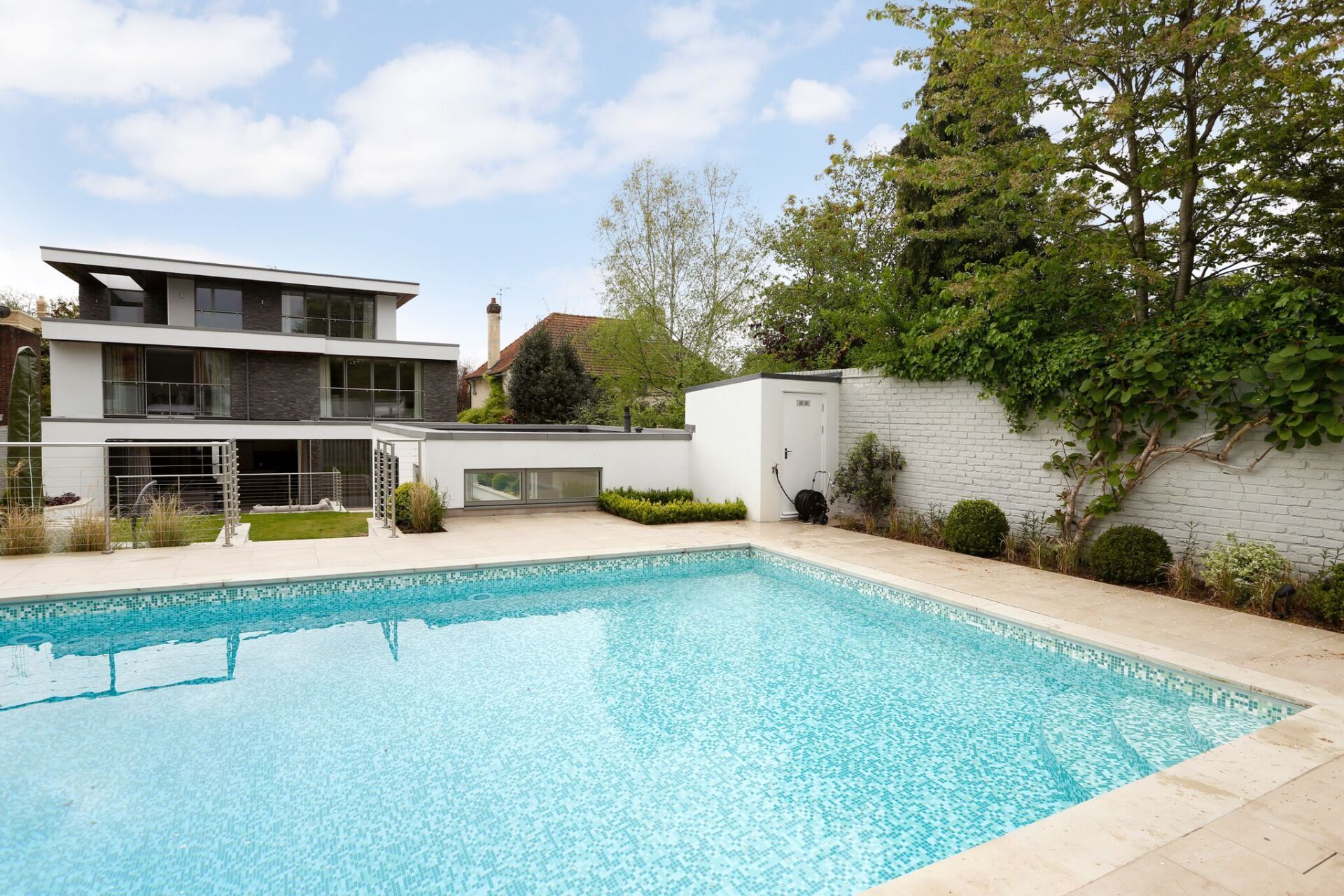 The five-bedroom property includes a range of luxury features, from the glass pendant chandelier visible through the double-height glass entrance, to the outdoor heated swimming pool surrounded by beautifully landscaped gardens.